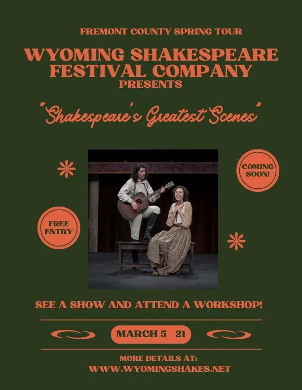 A two-actor tour of "Shakespeare's Greatest Scenes" in local schools, libraries, and community centers throughout central Wyoming. The 60-minute performance will include excerpts from A Midsummer Night's Dream, Hamlet, As You Like It, Romeo & Juliet, and The Taming of the Shrew. Each performance will be followed by a 15-minute talkback with the actors, as well as the option for a heightened language workshop. The workshop is open to all members of the community, regardless of age or experience. For the full performance and workshop schedule, visit the website below.